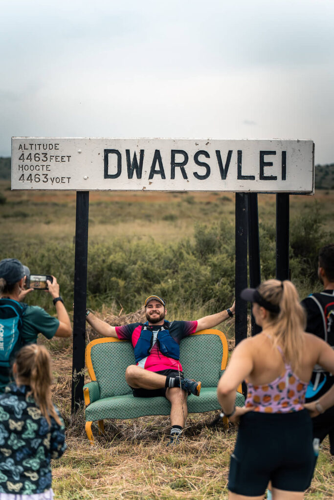 Route: The 22 km route offers the best views — starting beside the 100-year-old Nourse shed and winding through the poplar forest. The jeep track leads under a road culvert to the Java-friendly waterpoint and selfie zone. After a cappuccino and a quick pose on the Dwarsvlei couch, runners ascend a graded jeep track along Renosterberg with breathtaking Karoo vistas. At the summit, refill your bottles at a self-help waterpoint, then enjoy a rewarding downhill. Another pit stop awaits at the old Dwarsvlei siding before striding along unused train tracks toward your final culvert crossing.