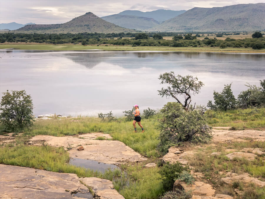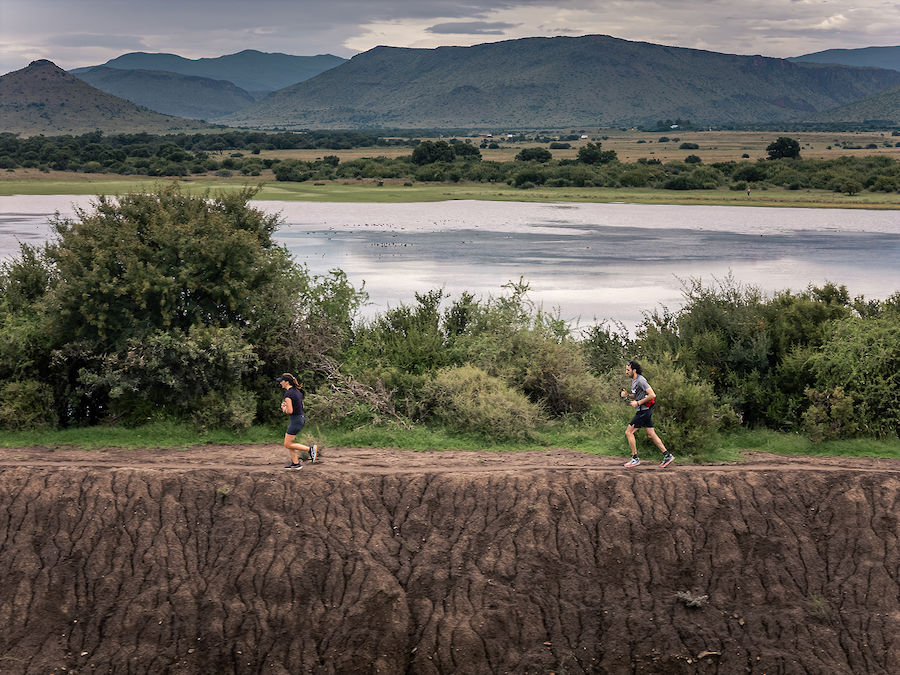 Route: With the ring of the bell, you head towards a slow gratifying ascent up the koppie as the last remnants of the day start fading, revealing the final glimpses of Renosterberg in the backdrop. A rolling gravel road darkens slowly, lit only by the soft trot of runners with headlamps as the route leads you to a big beautiful dam, which at night becomes a glistening mirror to the stars above. The road gently leads home through a majestic section of the poplar tree forest and ends alongside the 200-year-old stone walls — a one-of-a-kind night run in the Karoo.